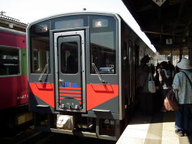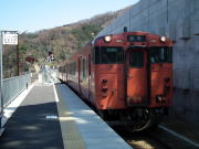 鳥取駅を出発した2両編成の山陰海岸ジオライナーは市街地を高架で通り抜け、天神川の川沿いをしばらく走って1面2線の無人駅・福部へ。女子高生と山陰海岸の話に興じている間に列車は大岩を過ぎ岩美駅に到着。岩美は山陰の海岸美とのどかな温泉情緒が漂う町だ。岩美駅からは左側の車窓に美しい山陰の海が見えてきた。列車は順調に走って陸上トンネルを抜けると兵庫県。列車は鳥取駅から36分ほどで浜坂駅に着いた。浜坂駅はローカル列車の発着基点駅でこれまで特急「はまかぜ」の一部を除いて全ての列車は上り下りともこの駅で乗換えだった。しかし今回の快速「山陰ジオライナー」はすぐに豊岡に向けて出発。あわてて筆者はここで名物の駅弁を購入。列車は久谷を過ぎ9時49分目的地の餘部駅に着いた。餘部で下車したのは3人だけ。餘部駅はホームから日本海・香住海岸を見渡すことの出来る風光明媚な高台にある駅だ。コンクリート打ちのモダンな待合室には近畿の駅百選認定駅のプレートが掲げられ旅の思い出を書き綴ったノートがベンチに置かれていた。先ずはその横で浜坂駅で買った米田茶店の駅弁「余部鉄橋物語」を食べ始めた。駅弁には「ありがとう さようなら餘部鉄橋」の一文が添えられていた。